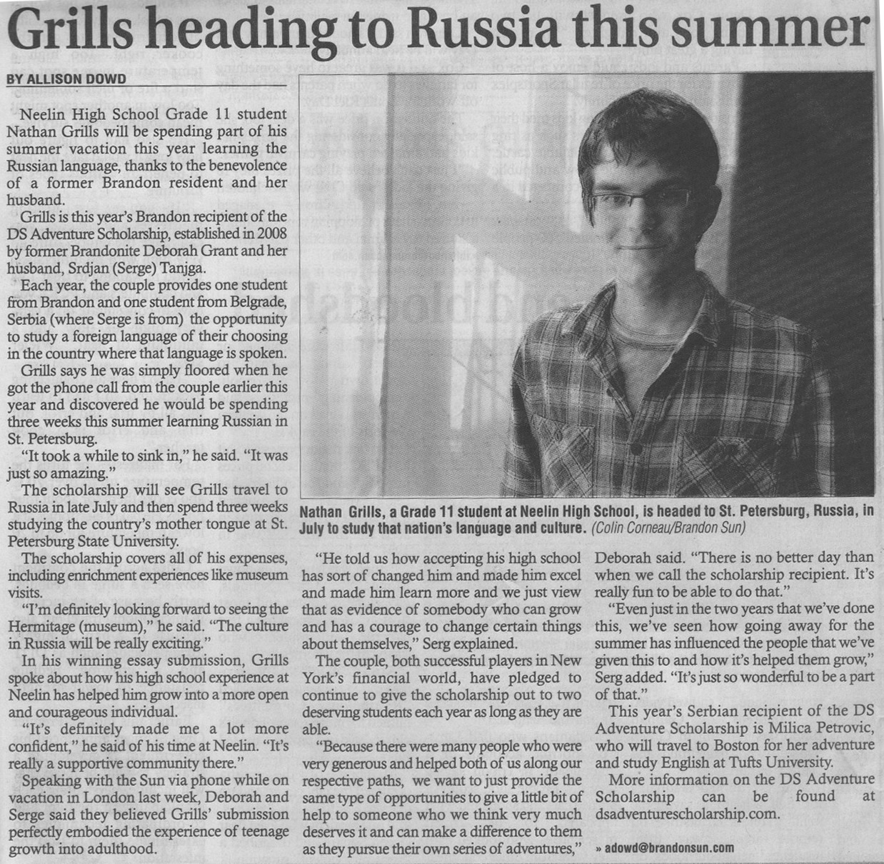 The scholarship is intended for one student from Brandon, Manitoba (where Deborah is from) and one student from Belgrade, Serbia (where Srdjan is from).